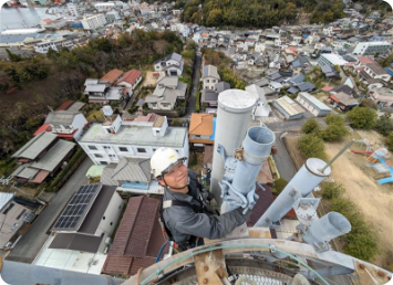 「移動体基地局工事」の通信技術と、「ロープアクセス」による特殊な塗装修繕技術を両立しています。
